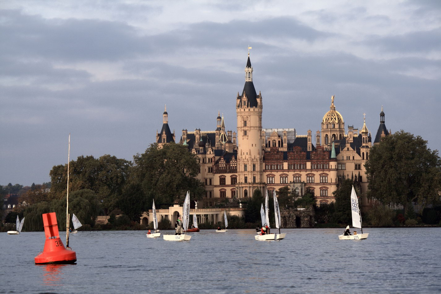 Dieses Wochenende haben wir zum 2. Mal am Herbstpokal teilgenommen. Der Herbstpokal findet immer am 2. Oktoberwochenende auf dem Schweriner See statt und ist sehr beliebt. Das macht sich zum Beispiel bei der Anmeldung bemerkbar, so war das Meldelimit bei Opti A (275 Boote) und Opti B (102 Boote) schon nach einem halben Tag erreicht. Bei der Organisation haben die Schweriner wie immer ganze Arbeit geleistet, so dass die 670 Boote der 6 Bootsklassen zwei reibungslose Wettkampftage hatten. Leider kamen wir zur Anmeldung am Freitag Abend 2 Minuten zu spät, die Rechner waren gerade heruntergefahren, darum mussten wir am Sonnabend besonders früh aufstehen.