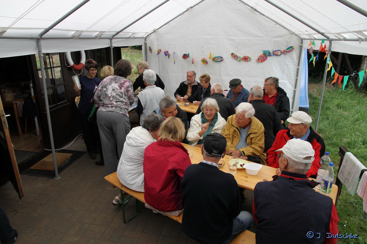 Ein üppig gedeckter Tisch mit selbstgebackenem Kuchen und Torte erwartete die Besucher unseres Hafenfestes. Nachdem vormittags die Vereinsmeisterschaft mit zwei Wettfahrten bei Windstärke 3 absolviert war, trafen sich die Teilnehmer und Gäste aus dem Nachbarverein 15:00 Uhr zu Kaffee und Kuchen im Festzelt.