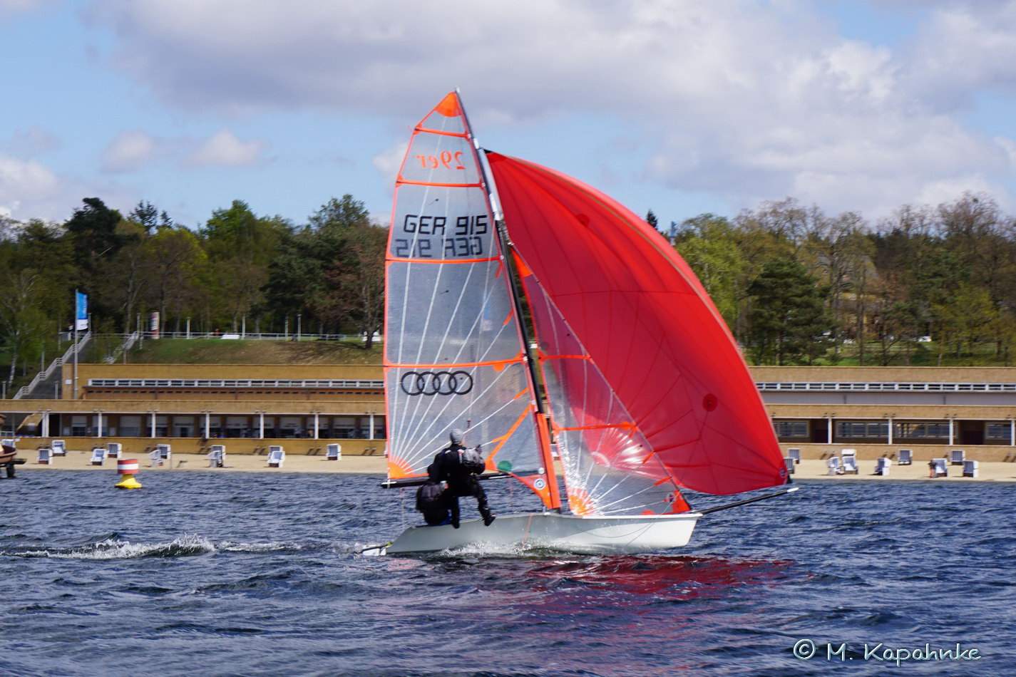 Die beiden Stammcrews auf GER 915 und GER 1058 mit Zeno und Kilian sowie Lamo und Ludwig haben am Samstag fünf Wettfahrten, bei teilweise frischem und böigem Wind durchgezogen. GER 1578 war mit Pauline und Andreas besetzt, aber nicht 100%ig fit (gerade auskurierte Erkältung und verstauchte Finger an der rechten Hand) und segelte zwei Wettfahrten mit. Danach wurde es zu kalt und die Kräfte ließen nach. Alle drei JGC-Crews mussten nicht nur einmal Bekanntschaft mit Wannseewasser schließen und es zeigte sich, dass ein dicker Neo + dickem Spraytop wärmehaushaltsmäßig durchaus mit einem Trockenanzug mit halten kann.